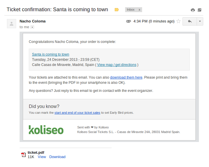 Yep. For us, that would be Friday. Since November, all e-mails sent by Koliseo (ticket confirmation, ticket sale alerts, invitations, whatever) will share the new format, spreading the word about how tall and good-looking your events are.